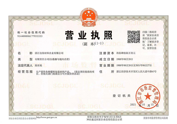 湛江包装材料企业有限公司是中国烟草行业辅料指定供应商,为国有控股中外合资企业,是湛江市国资委管理的国有企业之一,面向的客户群是全国各省市烟草公司,公司现拥有两条的德国布鲁克纳双向拉伸聚丙烯(BOPP)薄膜生产线及分切设备11台,生产能力达12000吨/年,国内卷烟薄膜市场占有率约为六分之一,位居全国前五强。公司于1996年获得ISO9001质量体系国际认证;1999年通过了ISO10012-1计量检测体系认证, 2005年起率先在国内实行产品条型码管理;2000年被评定为国家级火炬计划项目实施单位;近20年来均被评定为国家重点高新技术企业;2004年起,连年被评为全国重合同、守信用单位。公司“银丰YINFENG”牌卷烟包装膜是广东省名牌产品、广东省著名商标。公司拥有一个省级工程技术研究中心:广东省烟用包装BOPP薄膜工程技术研究中心。从事产品研发科技人员近40人,年研发费用投入近千万元,拥有国家专利60余个。在产品出口方面,公司于2019年底拓展了东南亚、伊朗卷烟薄膜市场,年出口超1000吨,实现外汇收入2000万元人民币。按照公司“十四五”规划要求,未来五年将全面打造中国BOPP薄膜领域第一品牌和中国最大的卷烟行业辅料供应商,建立中国烟草辅料产业园,项目一期主要生产BOPP高端双向拉伸膜及相关配套产品;二期主要生产烟标、卷烟用纸等烟草辅料。项目建成后,将带动我市近千人就业,完全投产后预计年产值将达到20亿元,年实现利税2亿元,利润1亿元。