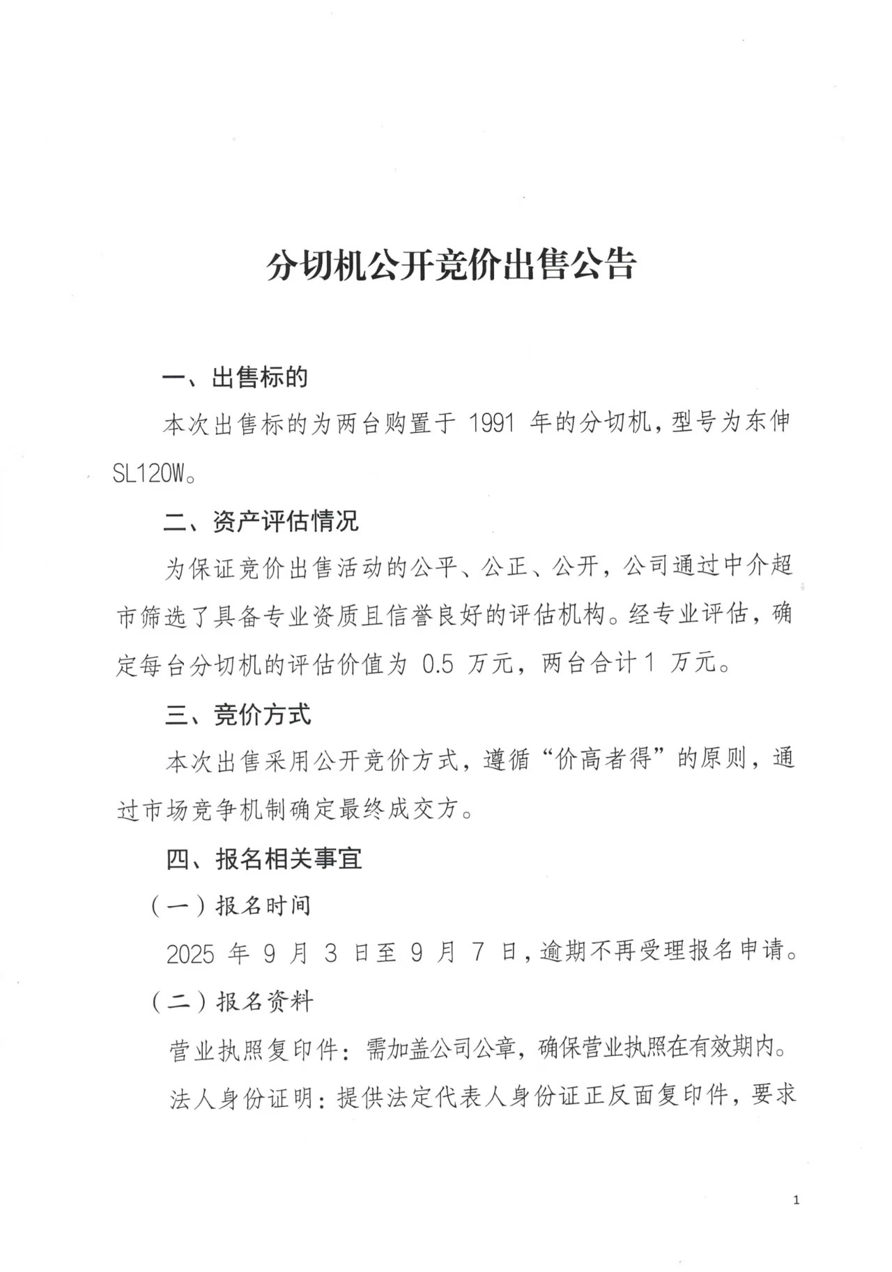 • 上一篇:关于分切机公开竞价出售相关信息的补充公告 2025/9/5