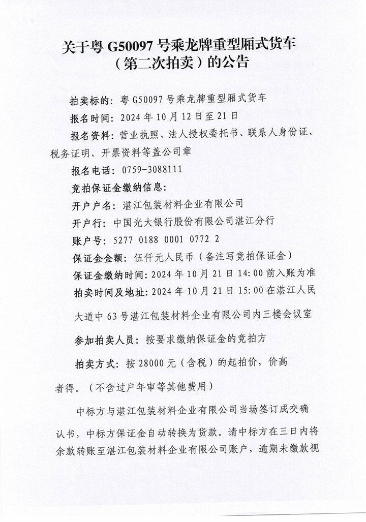 关于粤G50097号乘龙牌重型厢式货车 (第二次拍卖)的公告