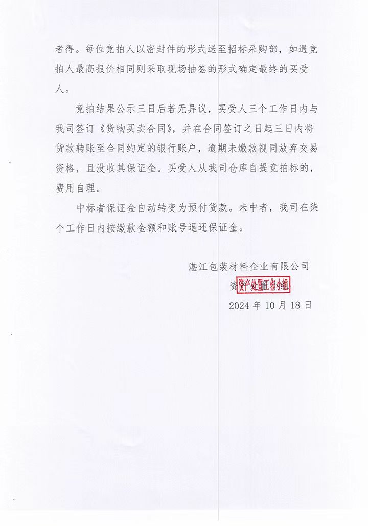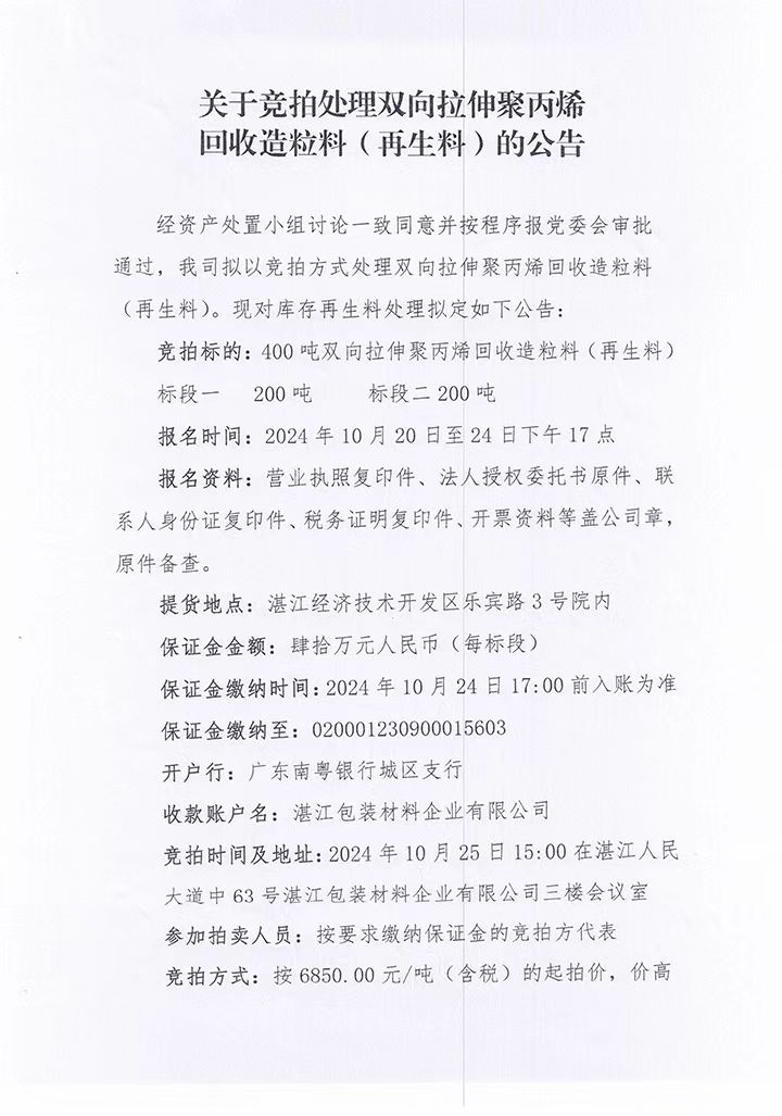 关于竞拍处理双向拉伸聚丙烯回收造粒料(再生料)的公告
