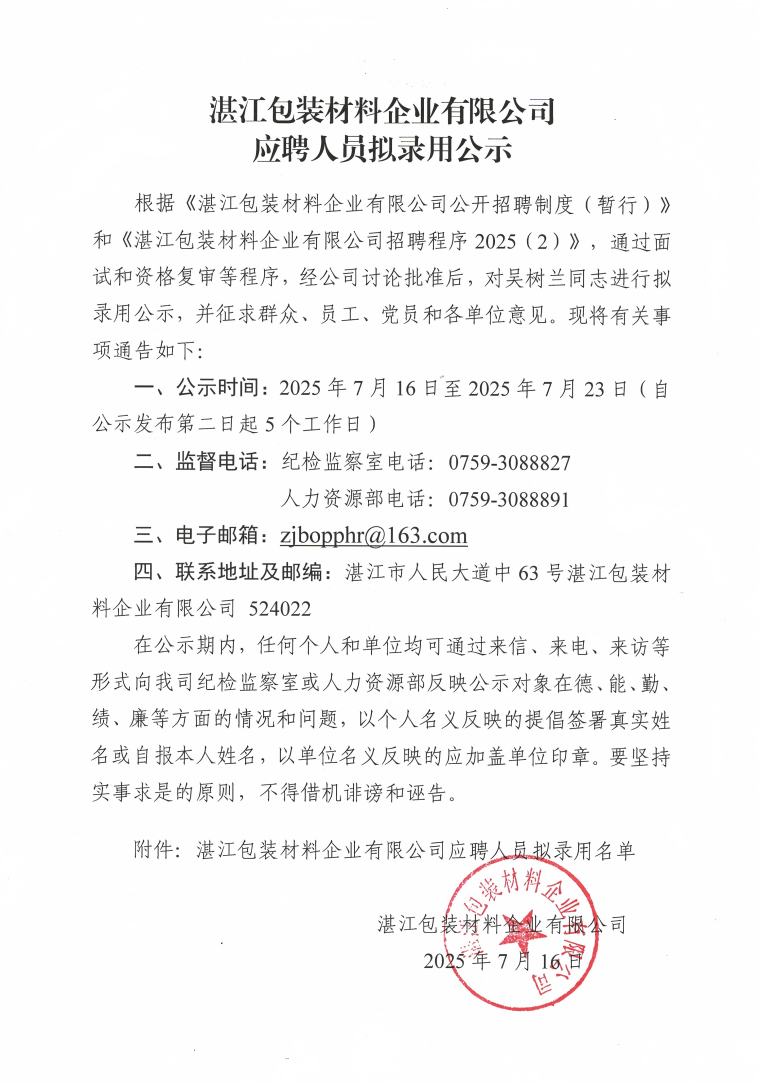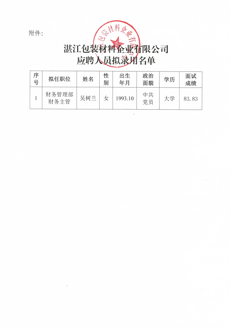 湛江包装材料企业有限公司应聘人员拟录用公示