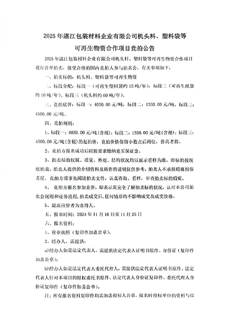 2025年湛江包装材料企业有限公司机头料、塑料袋等可再生物资合作项目竞拍卖公告
