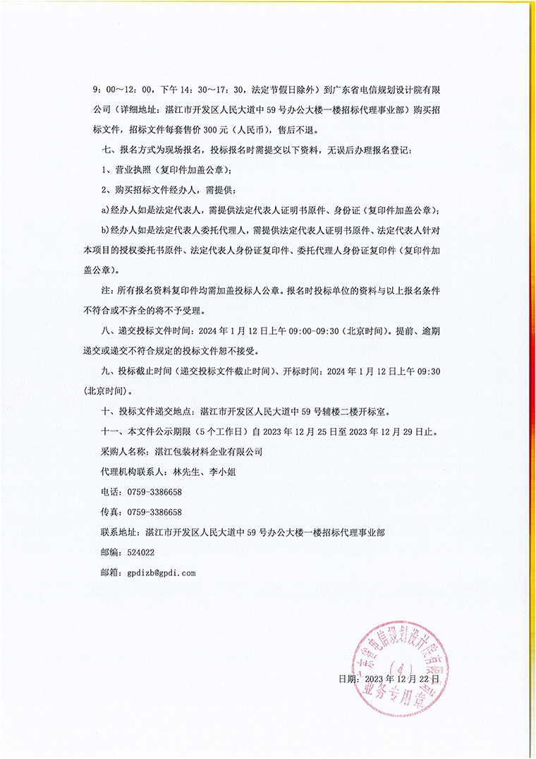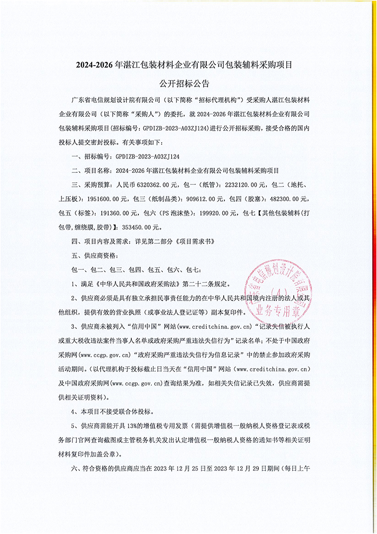 2024-2026年湛江包装材料企业有限公司包装辅料采购项目公开招标公告