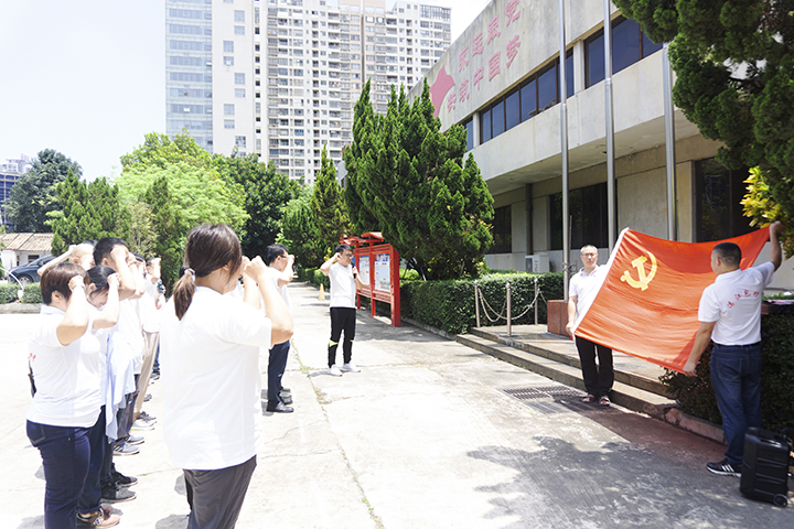 出发前,两个党支部一起重温入党誓词, 面向鲜艳的中国共产党党旗,全体党员举起右拳,铿锵有力的宣誓声响彻云霄。80个字的入党誓词是共产党人初心使命的集中体现,激励着全体党员以更加饱满的热情投身基层工作。