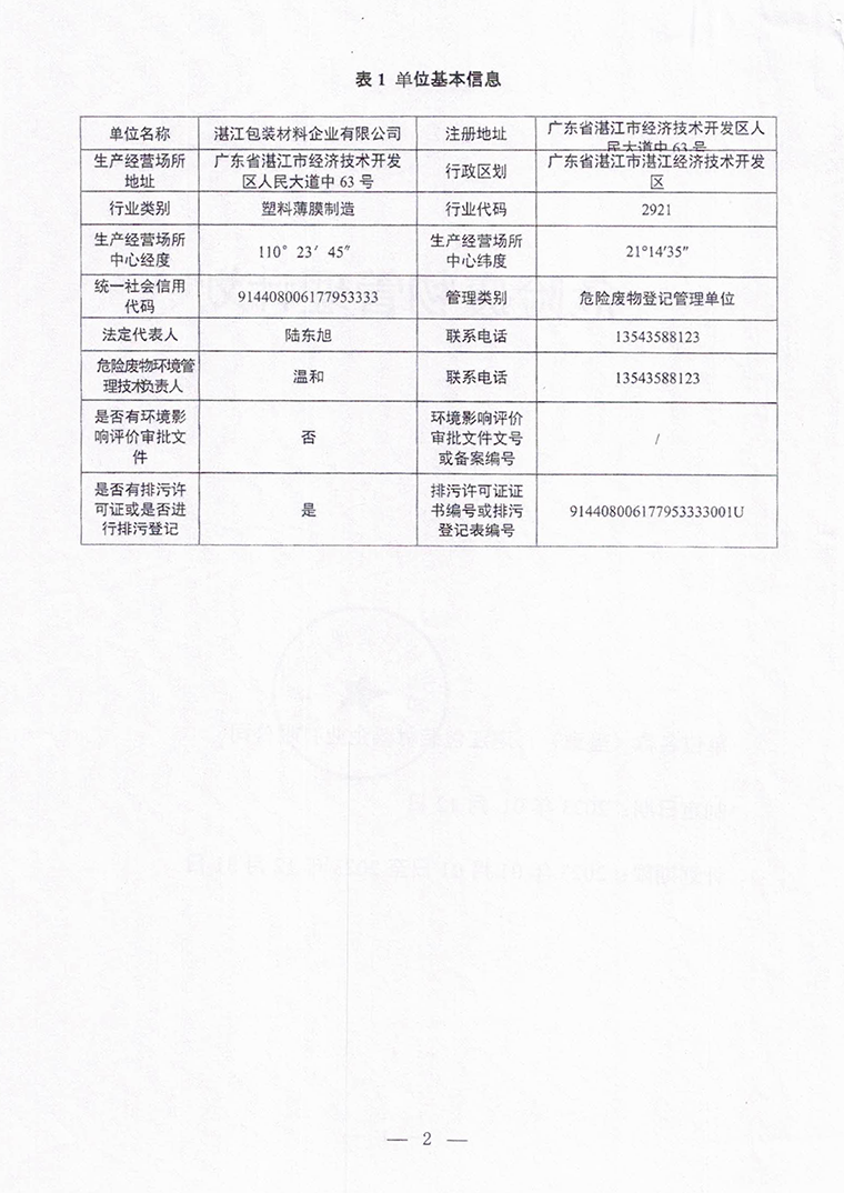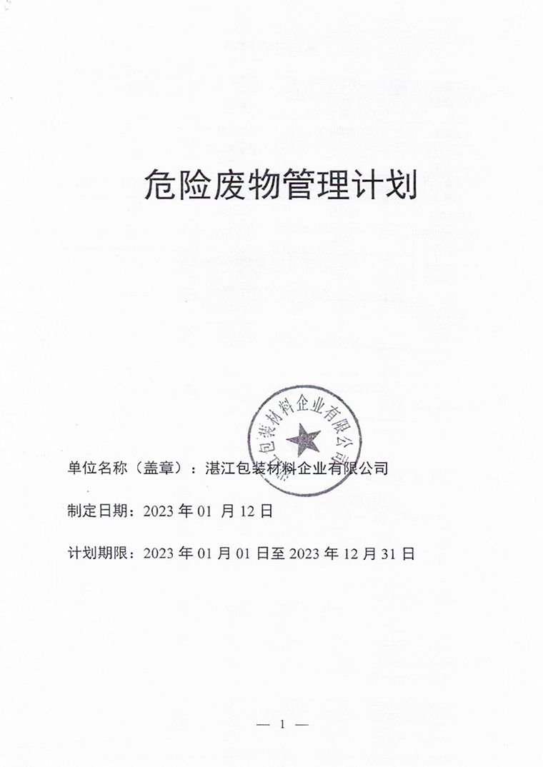 湛江包装材料企业有限公司2023年危废环境防治公示
