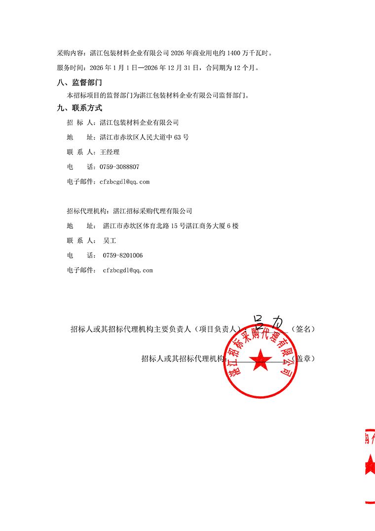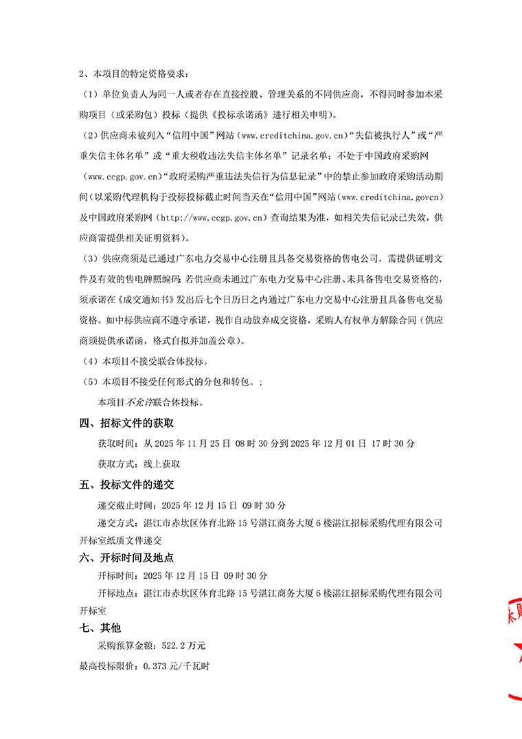 湛江包装材料企业有限公司2026年电力市场购电项目公开招标(招标编号:ZJZCDL2025-QC-GZ124)