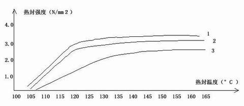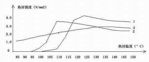 ....由于无规二元共聚物、无规三元共聚物和混合物三种热封材料的熔点依次为135°C、125°C、和115°C,呈逐步降低的趋势,因而它们的初始热封温度分别由高降至低,依次为115°C、105°C和100°C(以2.0N/mm2作为最低热封线),由热封曲线图可以看出,这三种材料的热封范围分别为: