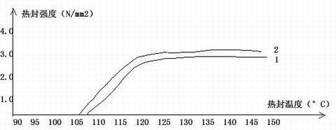 ....热封层材料为无规二元共聚物的22u标准配方的烟膜,表层、芯层厚度分别为0.8u/20.4u/0.8u和1.5u/19u/1.5u,在不同的热封温度下测出它们的热封强度并绘制成下图所示的热封曲线图: