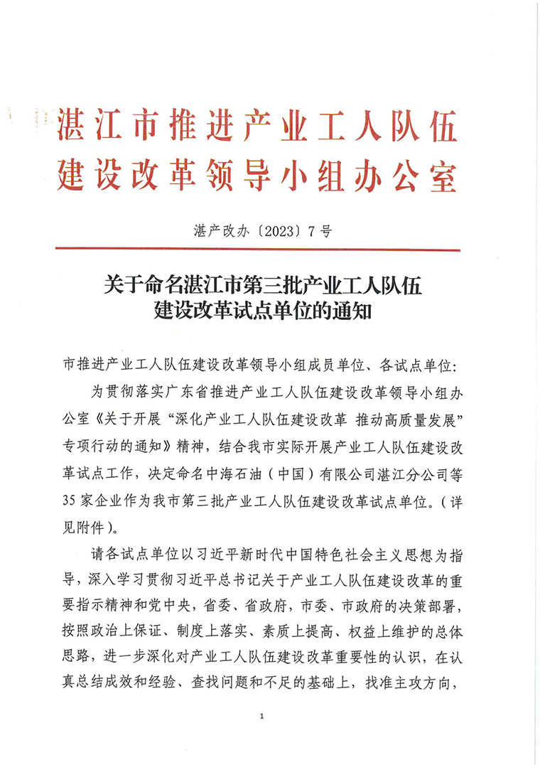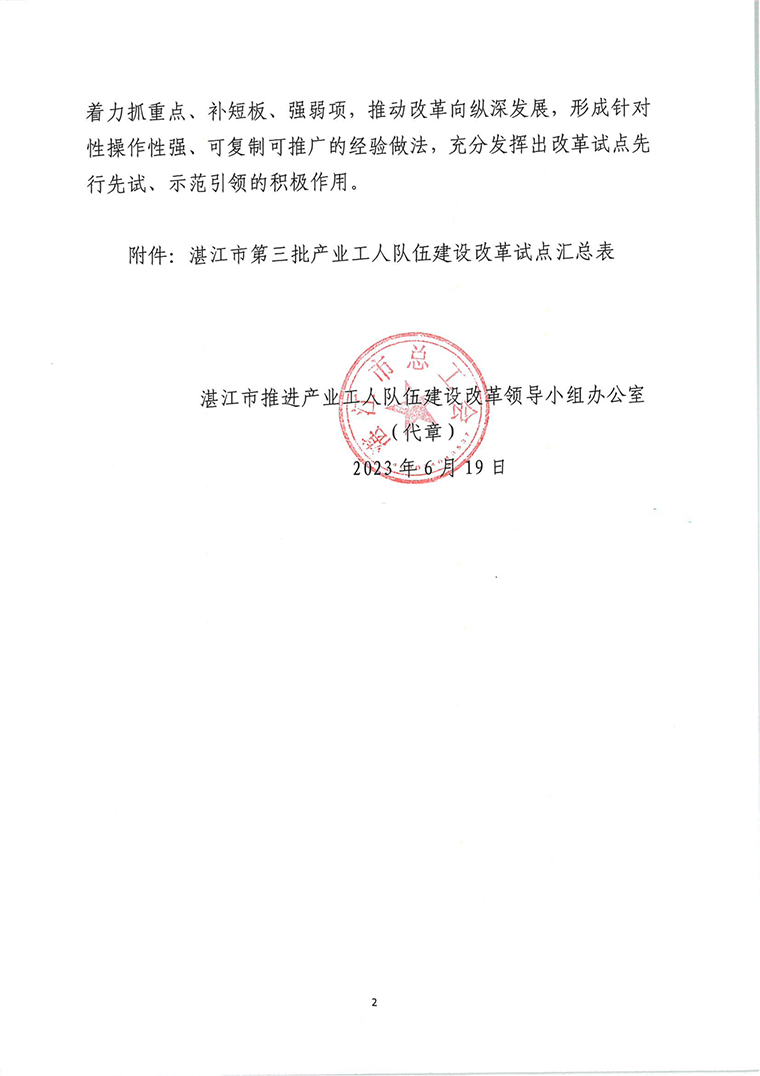 近日,经湛江市推进产业工人队伍建设改革领导小组办公室审批,市推进产业工人队伍建设改革领导小组办公室下发湛产改办〔2023〕7号《关于开展命名湛江市第三批产业工人队伍建设改革试点单位的通知》,我司被评为“第三批产业工人建设改革试点单位”。