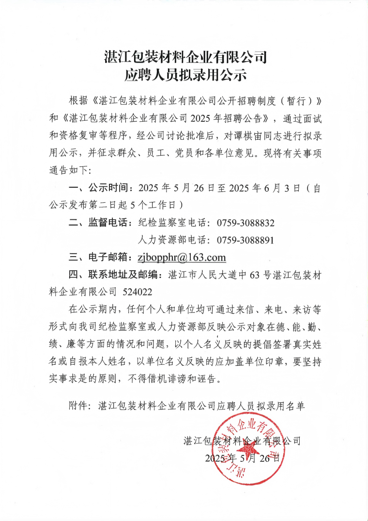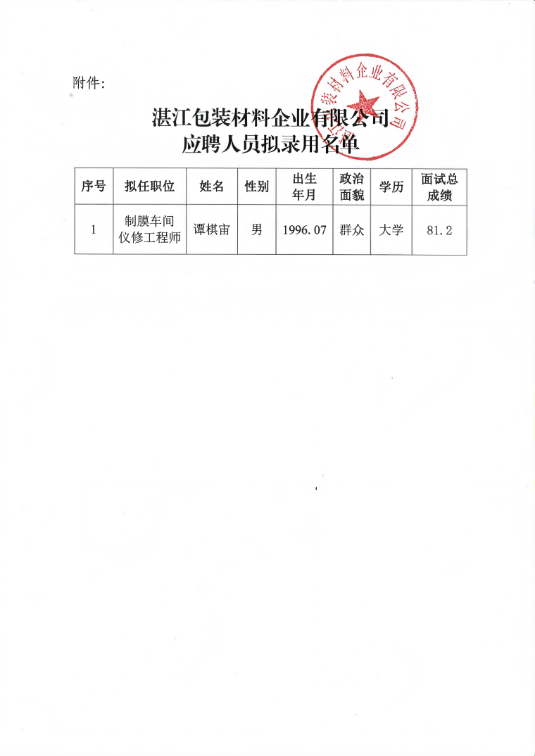 湛江包装材料企业有限公司应聘人员拟录用公示
