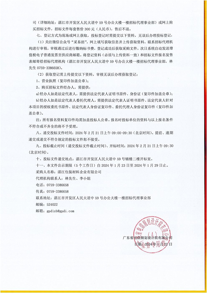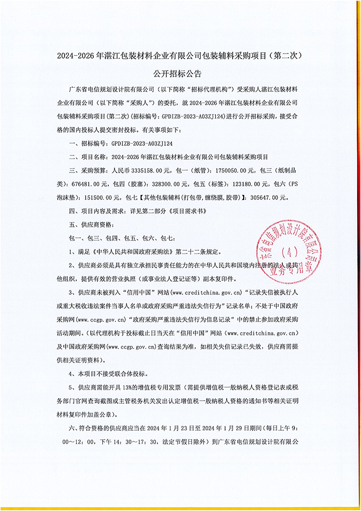 2024-2026年湛江包装材料企业有限公司包装辅料采购项目(第二次)公开招标公告