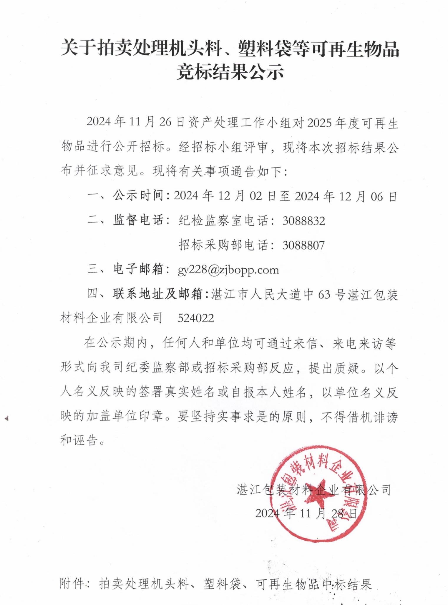 关于拍卖处理机头料、塑料袋等可再生物品 竞标结果公示