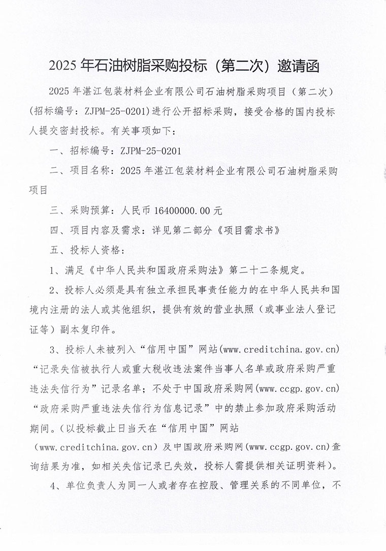 2025年石油树脂采购投标(第二次)邀请函
