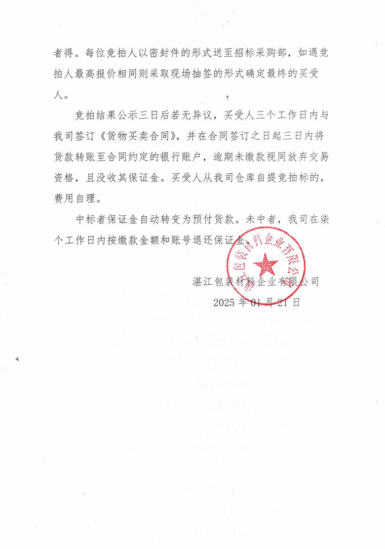 • 下一篇:2025年湛江包装材料企业有限公司石油树脂采购项目招标结果公 2025/1/17
