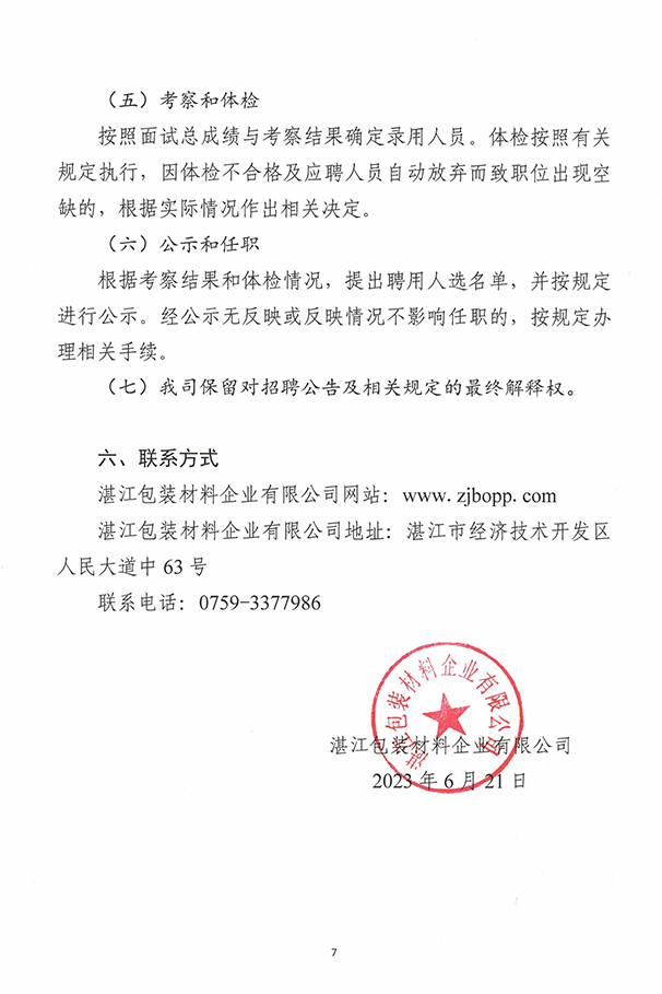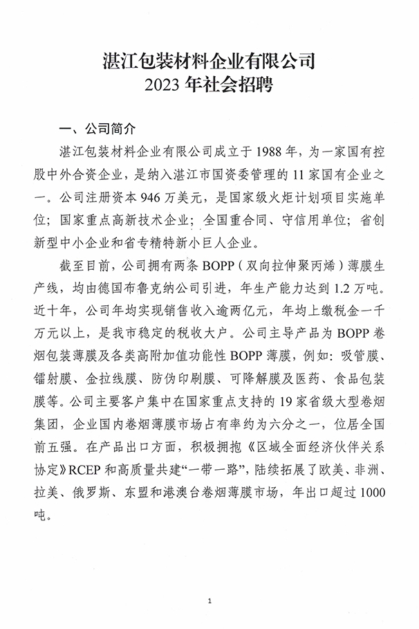 湛江包装材料企业有限公司2023年社会招聘