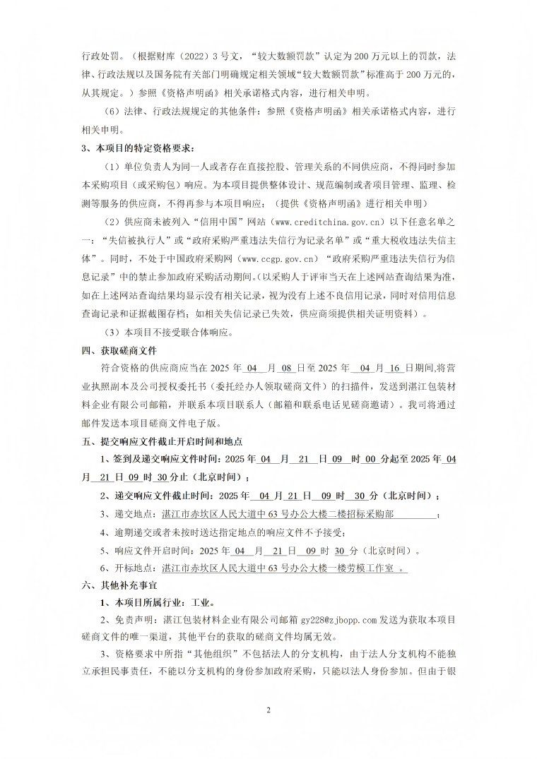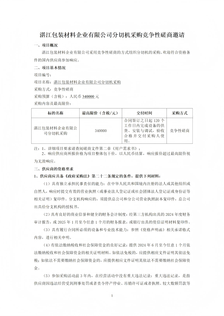 湛江包装材料企业有限公司分切机采购竞争性磋商邀请