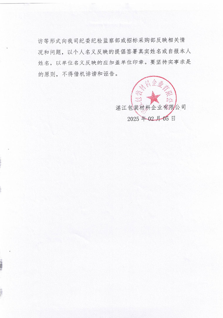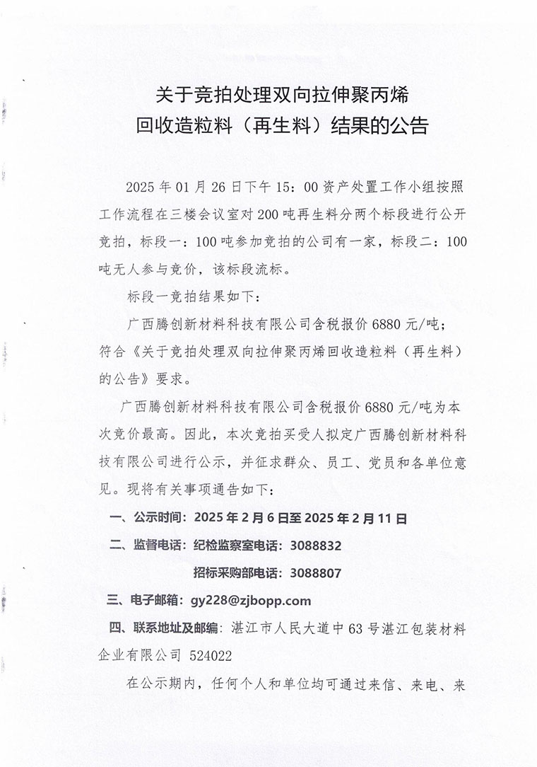 关于竞拍处理双向拉伸聚丙烯回收造粒料(再生料)结果的公告
