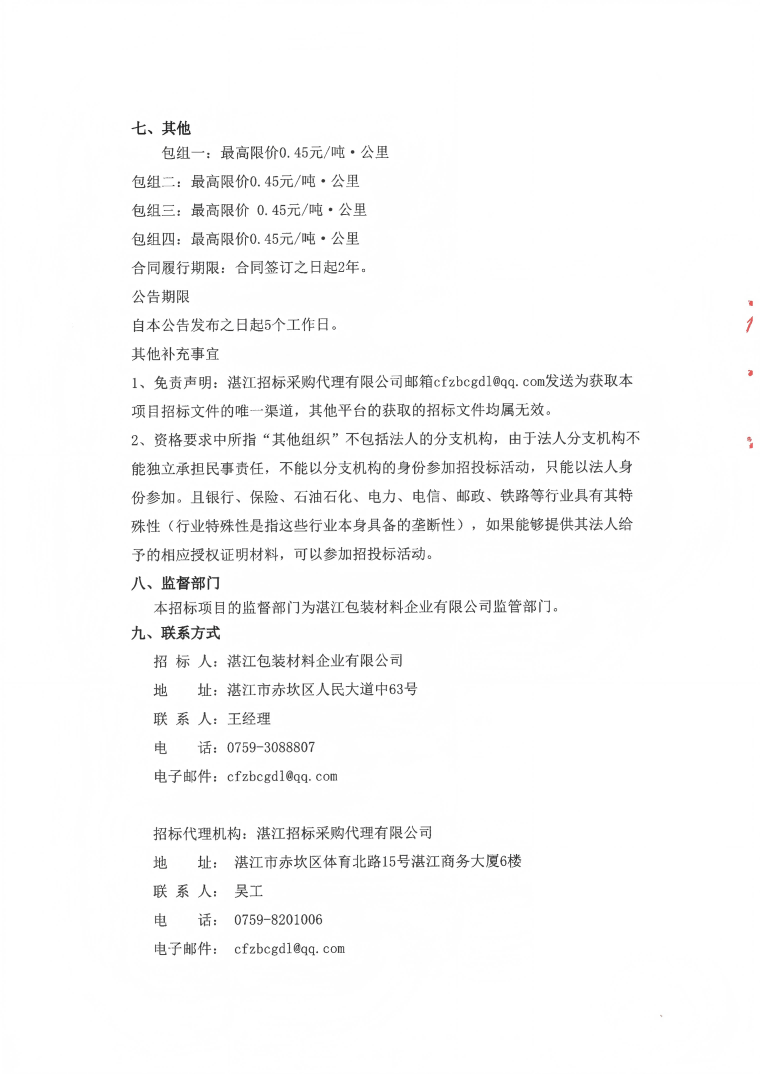 湛江包装材料企业有限公司2025年8月-2027年7月物流运输服务商项目