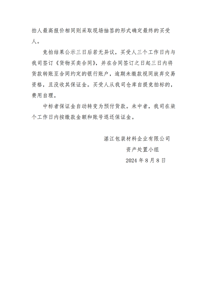 关于竞拍处理双向拉伸聚丙烯 回收造粒料(再生料)的公告