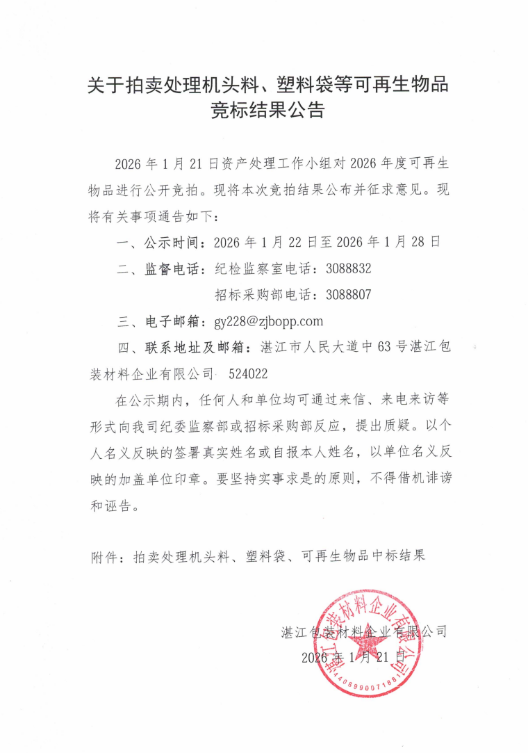 关于拍卖处理机头料、塑料袋等可再生物品竞标结果公告