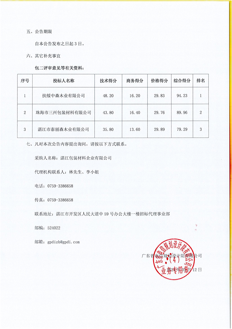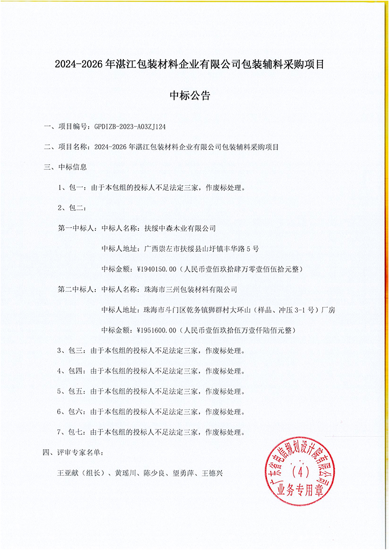 2024-2026年湛江包装材料企业有限公司包装辅料采购项目中标公告
